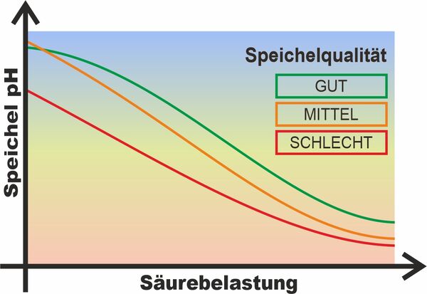 Gesunder Speichel ist basisch mit einem pH von 6.6 bis 7.2. Aber der pH Wert alleine ist nicht entscheidend, sondern auch die Kraft der Pufferung. Je mehr Basen im Speichel, umso mehr Säuren können neutralisiert werden.